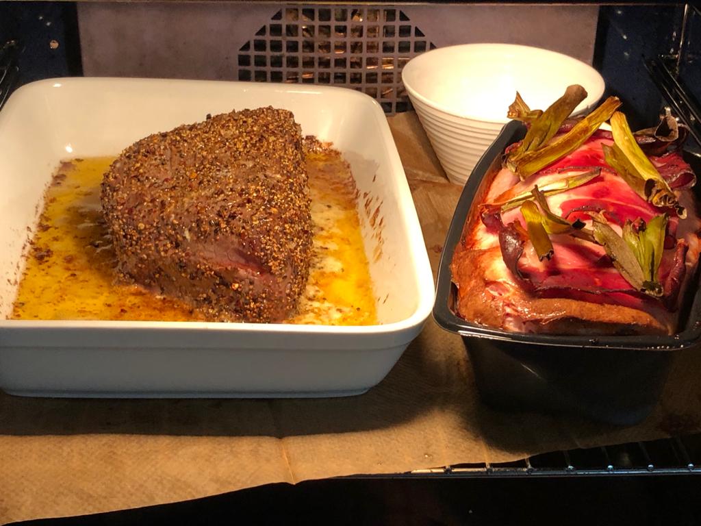 Bei 100 Grad je nach Dicke des Fleischstücks weitere ca. 90 Minuten im Ofen garen lassen.